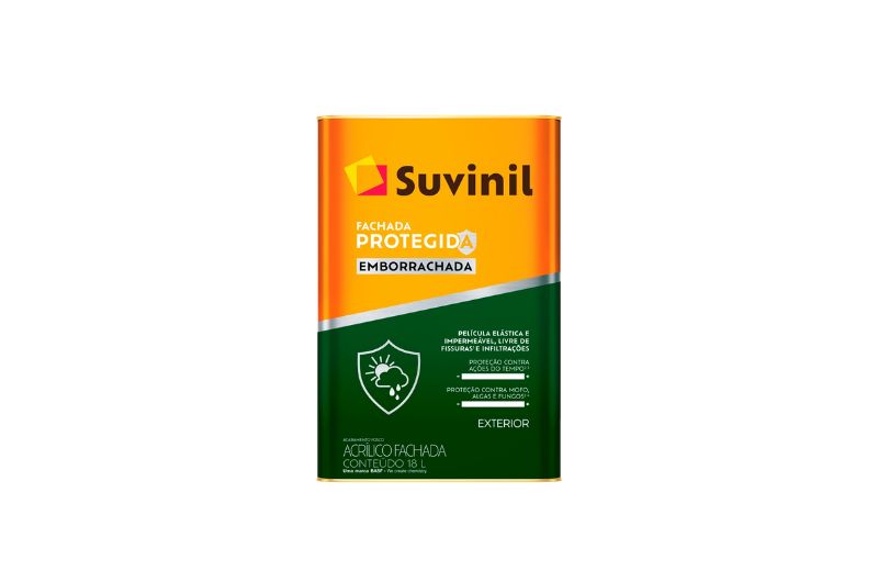 Fazer a pintura externa de casas com a Suvinil Proteção Total significa contar com alto rendimento. Ela está disponível em embalagens de 3,6 L e 18 L. A primeira rende até 17 m² acabados. A segunda rende até 85 m² acabados.